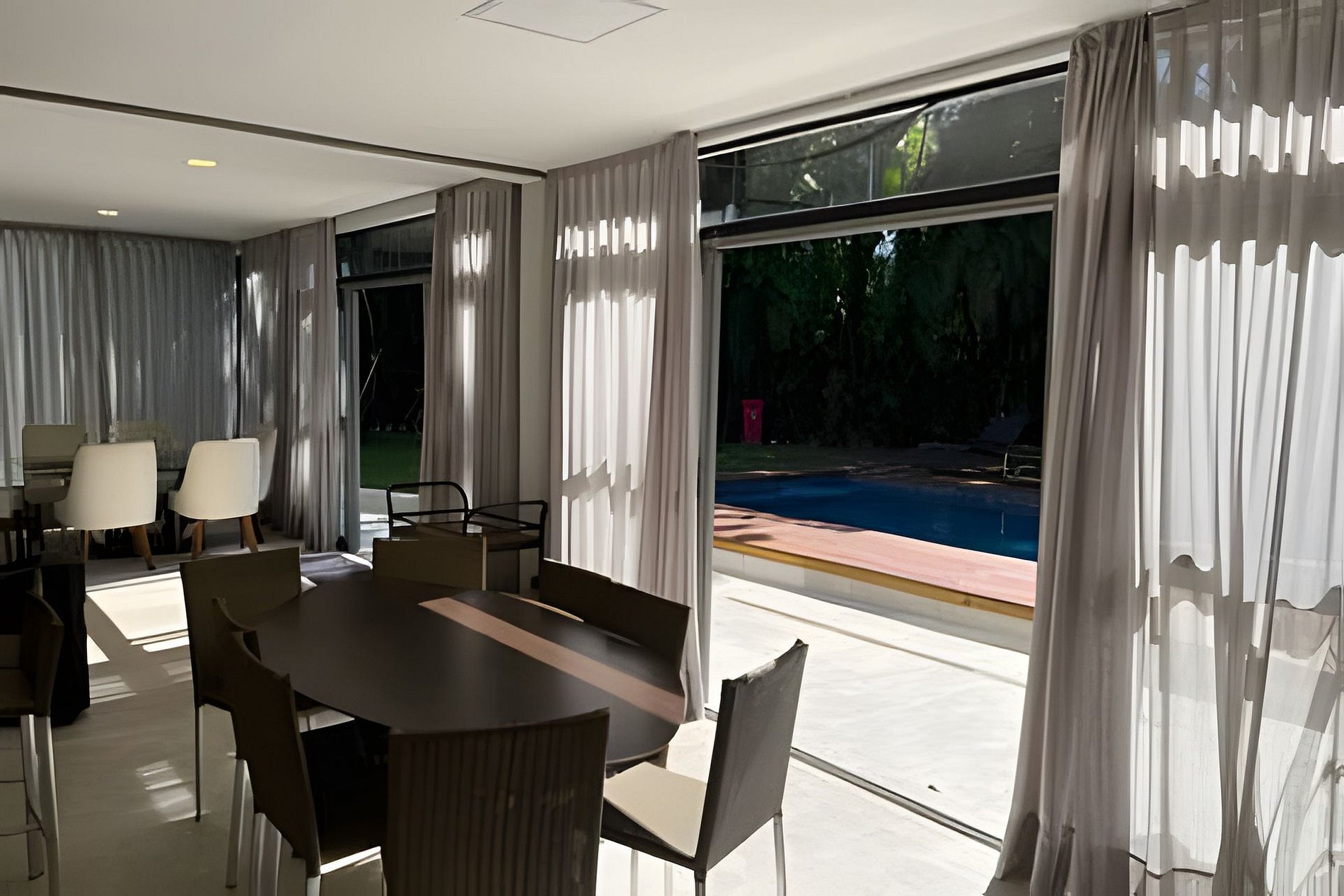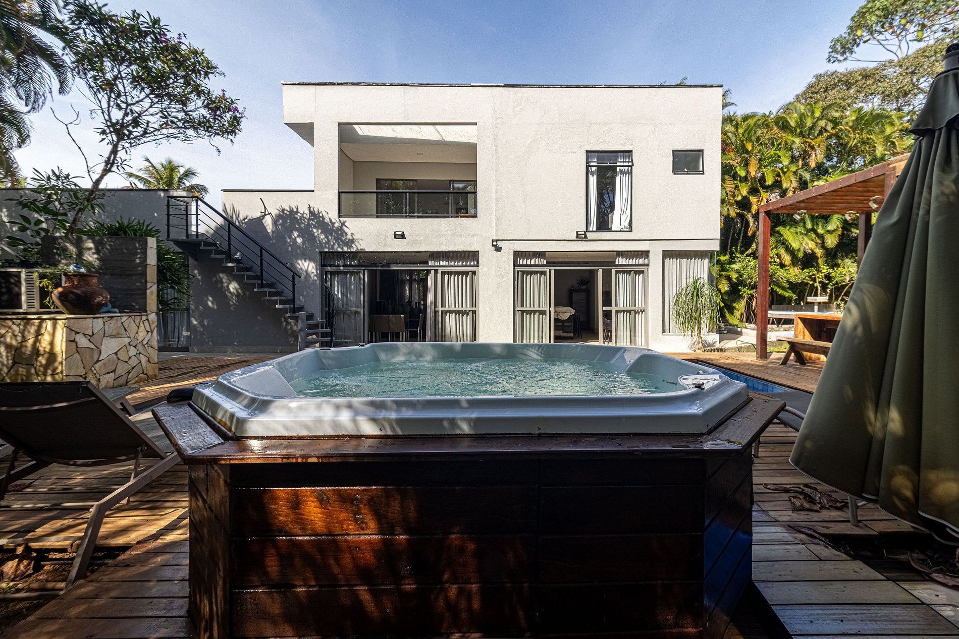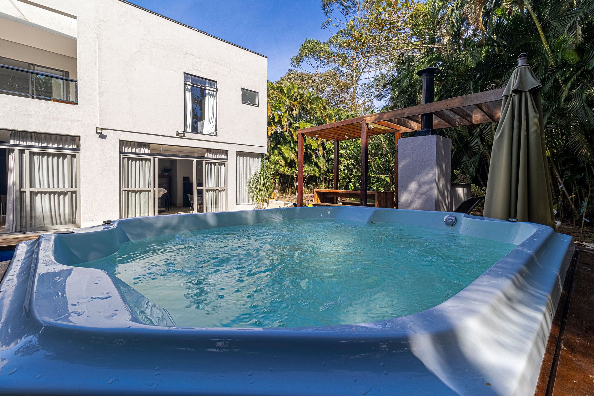 Além disso, a casa dispõe de uma adega e um bar, oferecendo uma experiência ainda mais completa para quem aprecia uma boa bebida. Para os dias mais quentes, há ar-condicionado em todos os ambientes, garantindo o clima ideal em qualquer estação. A internet de alta velocidade e TVs em todos os cômodos complementam o conforto, tornando essa casa um verdadeiro refúgio de luxo e modernidade