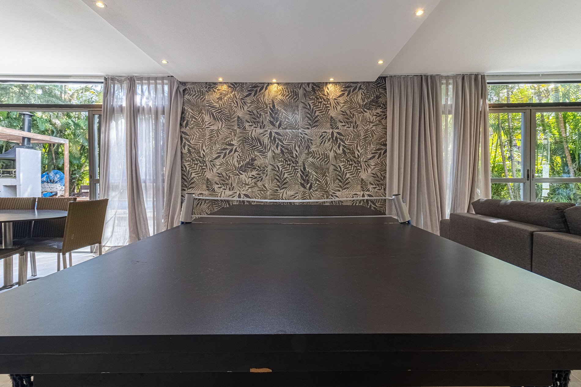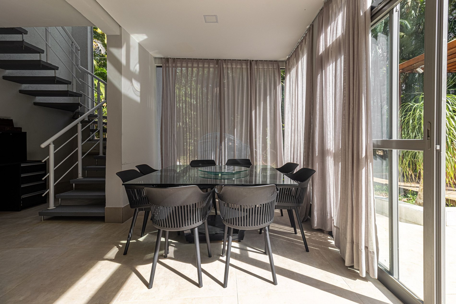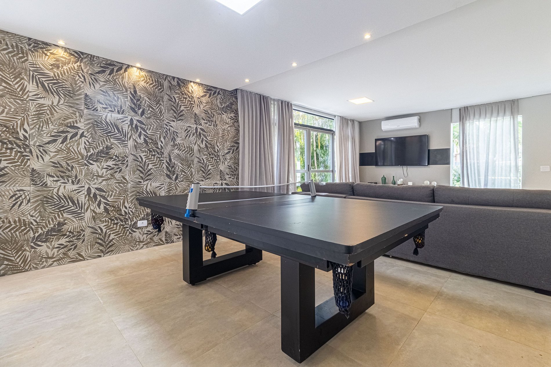 No térreo, encontram-se mais 3 suítes, sendo uma delas externa, ideal para hóspedes que preferem mais privacidade ou para acomodar grupos maiores. A ampla sala de estar possui 4 ambientes integrados: duas elegantes salas de jantar com uma cozinha moderna e completa, uma sala de jogos equipada com uma mesa que pode ser usada para sinuca ou pingue-pongue, e uma confortável sala de TV com sofás macios e uma TV de 50 polegadas, perfeita para momentos de lazer.