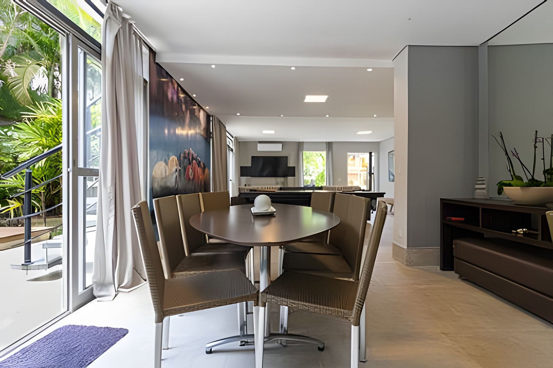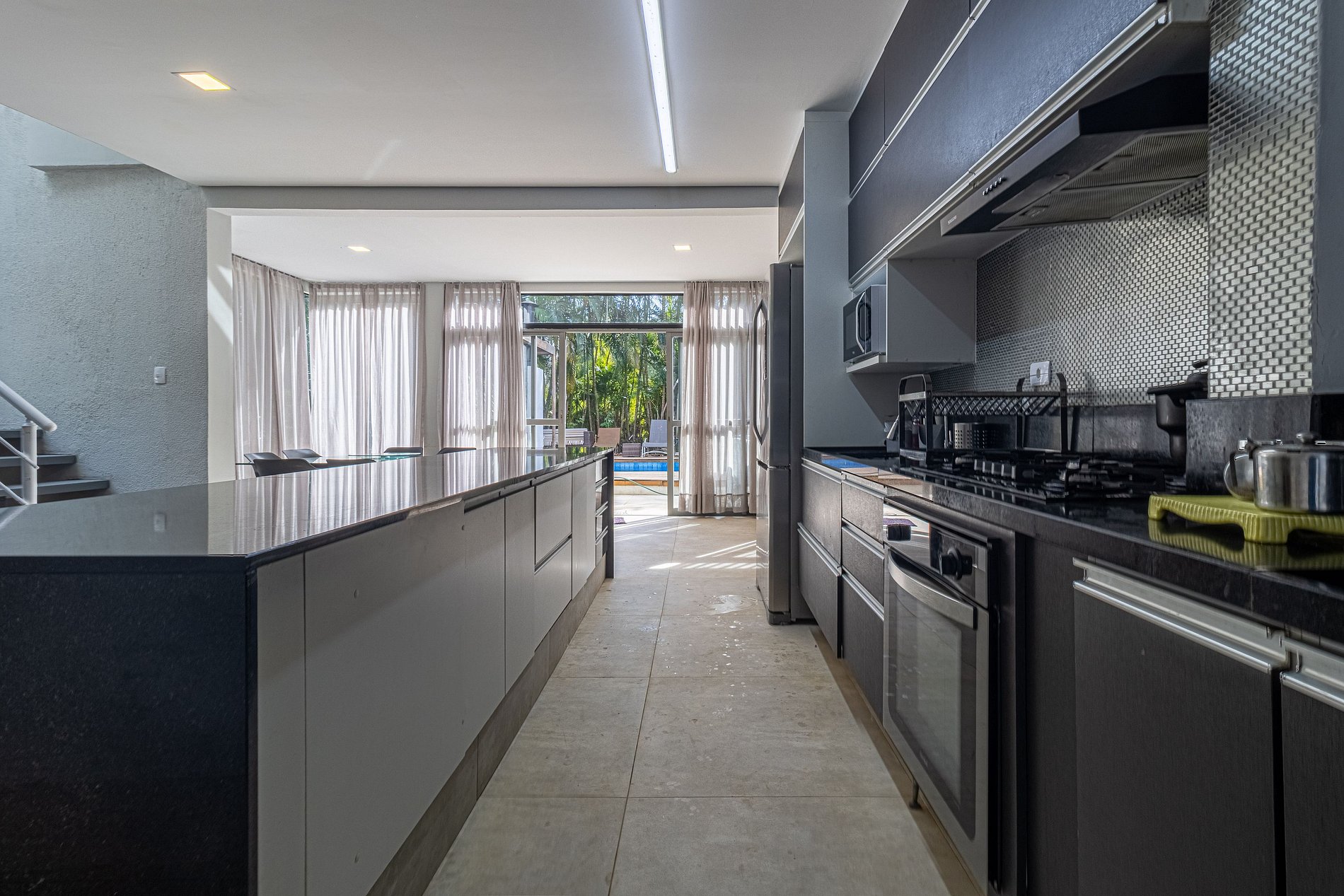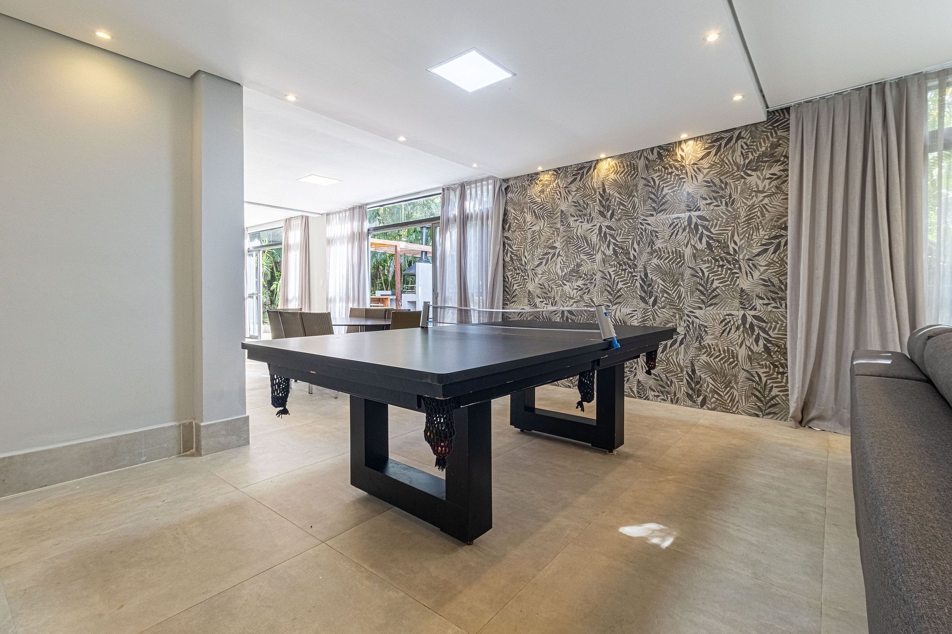 No térreo, encontram-se mais 3 suítes, sendo uma delas externa, ideal para hóspedes que preferem mais privacidade ou para acomodar grupos maiores. A ampla sala de estar possui 4 ambientes integrados: duas elegantes salas de jantar com uma cozinha moderna e completa, uma sala de jogos equipada com uma mesa que pode ser usada para sinuca ou pingue-pongue, e uma confortável sala de TV com sofás macios e uma TV de 50 polegadas, perfeita para momentos de lazer.